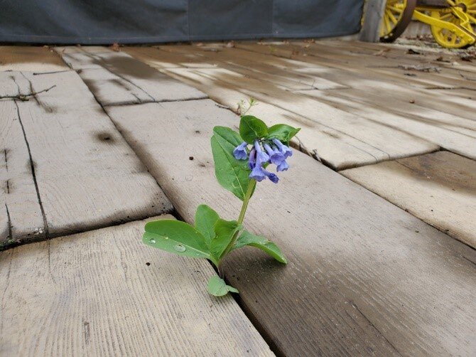 The second photo is a great example for us. This bluebell seed was stuck under the bricks at the chuckwagon across the river. Where God has you planted today, even if it might seem like you are under the concrete, with God’s help you can BLOOM.